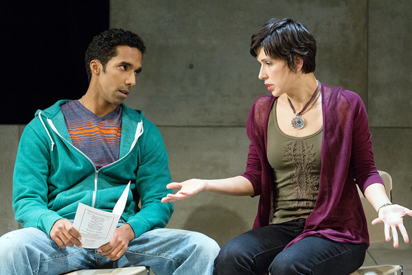 In Water, Hudes alternates between two plots. The first finds Iraq veteran Elliott Ortiz returning to Philadelphia and a rocky readjustment to civilian life – he’s an aspiring actor forced by circumstances to work in a sandwich shop, while at home, the woman who raised him is losing her battle with cancer. Elliot’s confidante is his cousin Yazmin, who has her own issues, though her life and career (she’s a composer and college teacher) seem more rooted and successful than Elliot’s. The second plot involves an on-line chat room for recovering addicts – four people participate (we know them only by their handles, e.g. “Fountainhead” and “Chutes & Ladders”), and again, the focus is on how they get through, day by day.