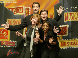 THE MUSICAL OF MUSICALS: THE MUSICAL (York Theatre, Lexington at 54th Street). This off-Broadway charmer takes an archetypal story – maiden who can’t pay the rent vs. villainous landlord – and sets it as five mini-musicals, each sending up a different theatrical model: Rodgers and Hammerstein, Sondheim, Jerry Herman, Andrew Lloyd Webber, and Kander and Ebb. Every parody not only sends up the appropriate style (aged contralto hooting out a Life Affirming Message in R&H, black-clad dancers dragging chairs in Kander and Ebb) but offers superlative puns (lecherous Sondheim landlord makes “specific overtures”) that cite related works. The four performers (two of whom also wrote MUSICALS) are immensely winning individually and collectively, and the bare-bones-ness of the production only makes it all funnier. So much of MUSICAL is referential that I’m not sure it will hold much allure to the non-fan… but aficionados will knock themselves out trying to identify every clue, and might well want to see the show more than once.