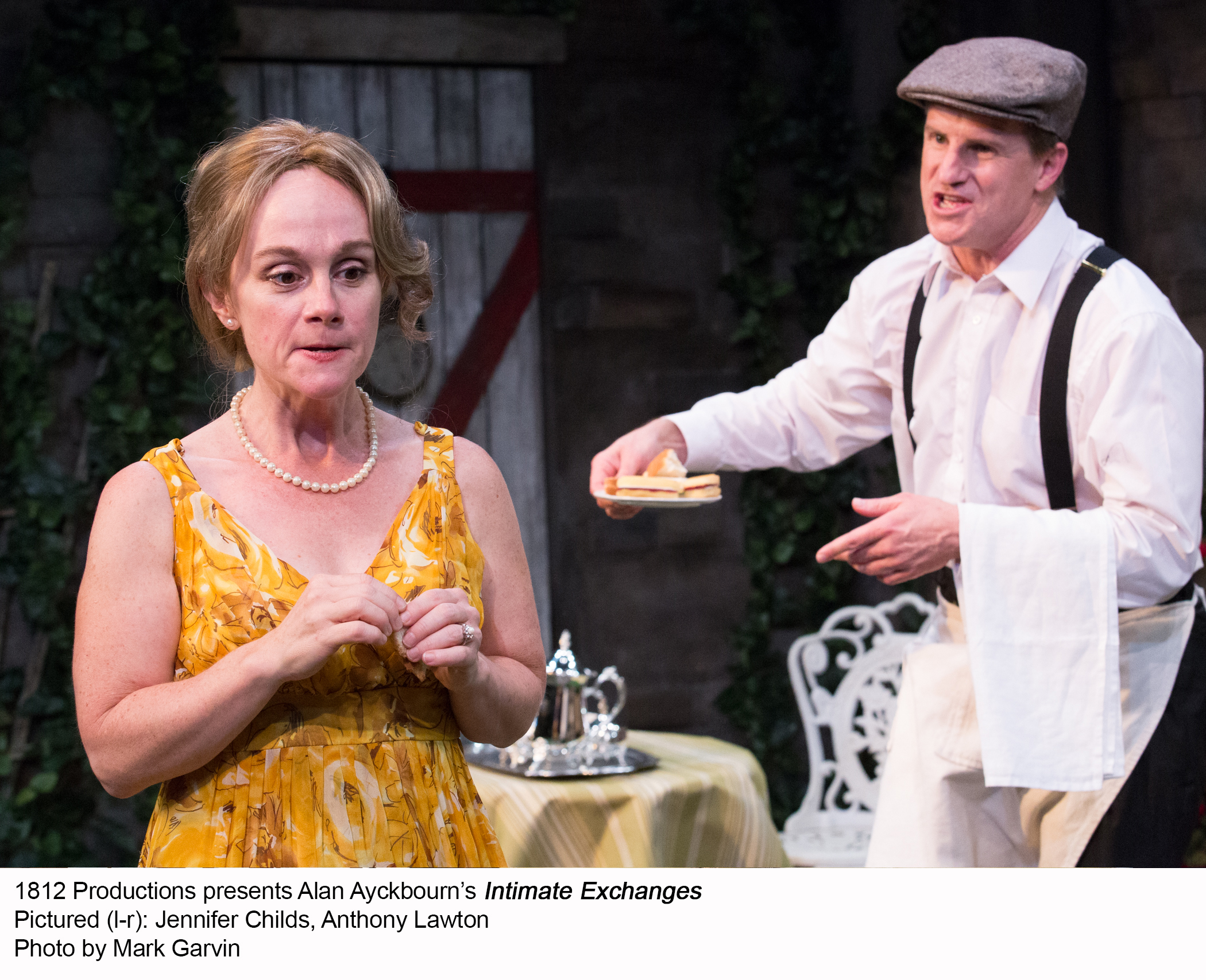 At 1812, director Mary Carpenter and two treasured Philadelphia actors – Jennifer Childs and Anthony Lawton – nail almost all of it. To start, they’ve come up with what to my knowledge is a first in presenting Intimate Exchanges – the audience gets to decide which paths the plot will take during the course of the show. (Ayckbourn’s plan was to present the variations in rep, with the different versions decided in advance.) Frankly, I was skeptical – wouldn’t this interrupt the story, essentially turning the show into sketch comedy?