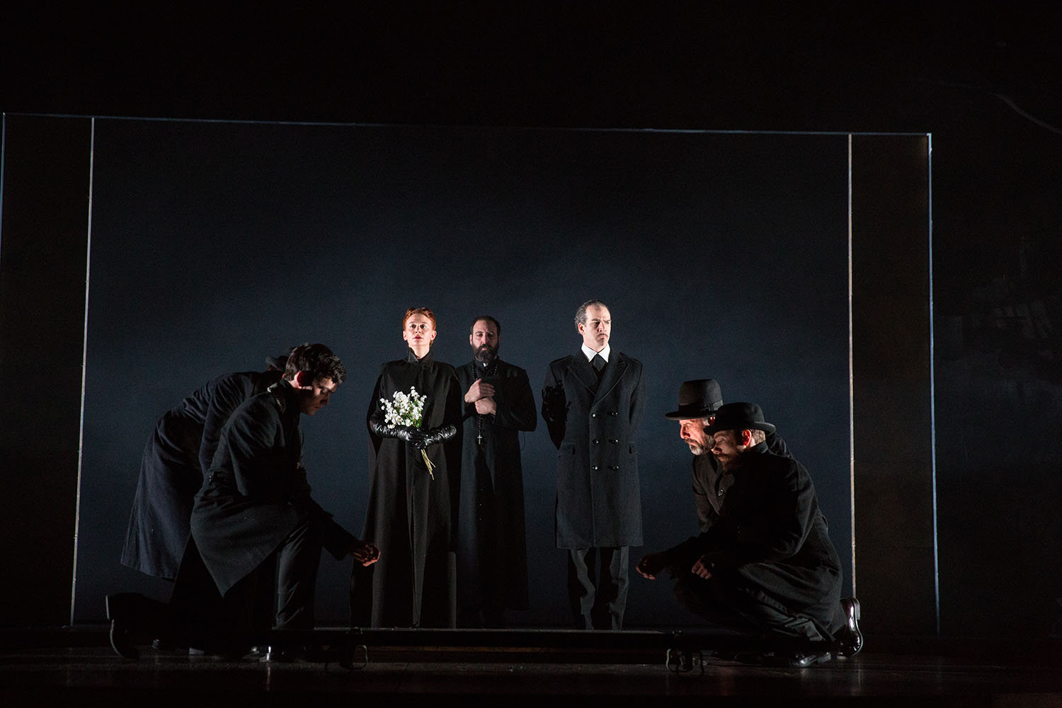 Hamlet company at the Wilma Theater, including Krista Apple-Hodge (Gertrude), Ed Swidey (Priest), and Steven Rishard (Claudius). (Photo by Alexander Iziliaev)