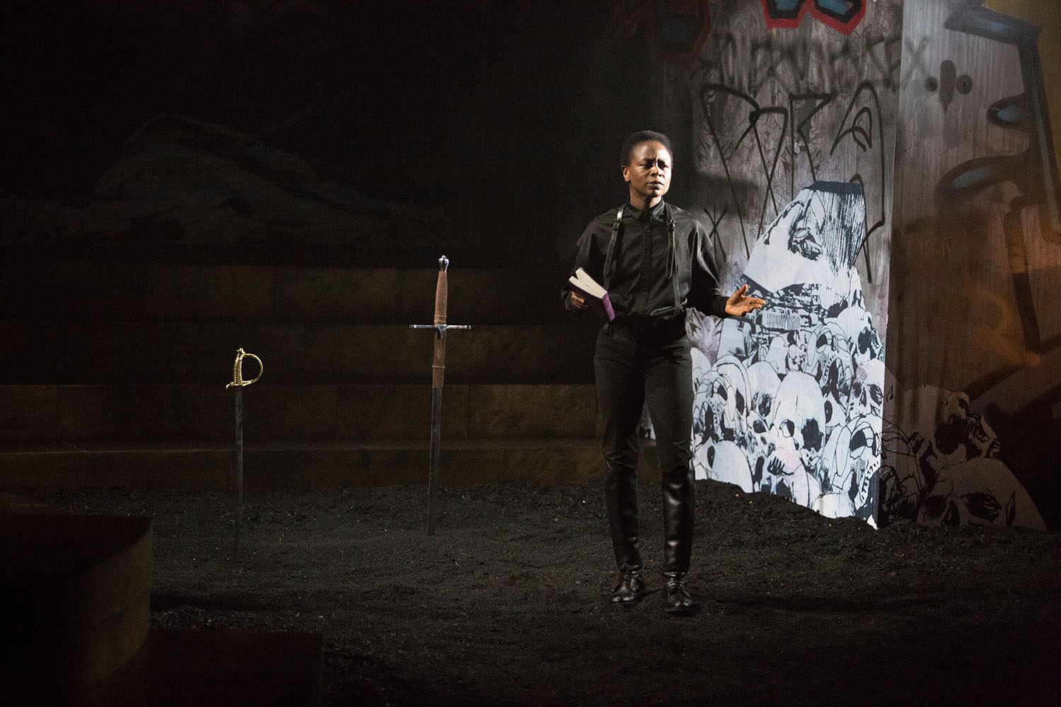It’s a shame, because the most daring production choice – casting an actress in the role of Hamlet, Prince of Denmark – pays off handsomely. Zainab Jah looks convincingly androgynous, has a marvelously expressive face and voice, and imbues her many speeches with radiant intelligence. I’ve seen some Hamlets who found more variety and slyness in the role, but Jah is excellent.