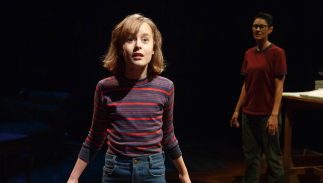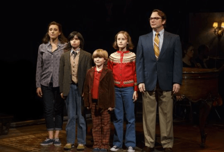 First, though – the admiration. It starts with the almost miraculous way Lisa Kron’s libretto captures the flavor of Alison Bechdel’s graphic memoir, which I would have thought pretty much untranslatable. Using three actors to play Bechdel at different ages (Sydney Lucas is Small Alison, Emily Skeggs is Middle Alison, and Beth Malone the adult) works seamlessly, and defines from the start the sense that this is a tale where observation was a major element. Fun Home deals mostly with Alison’s coming of age as a lesbian, a narrative that is juxtaposed against the story of her father, a closeted gay man who ultimately commits suicide.