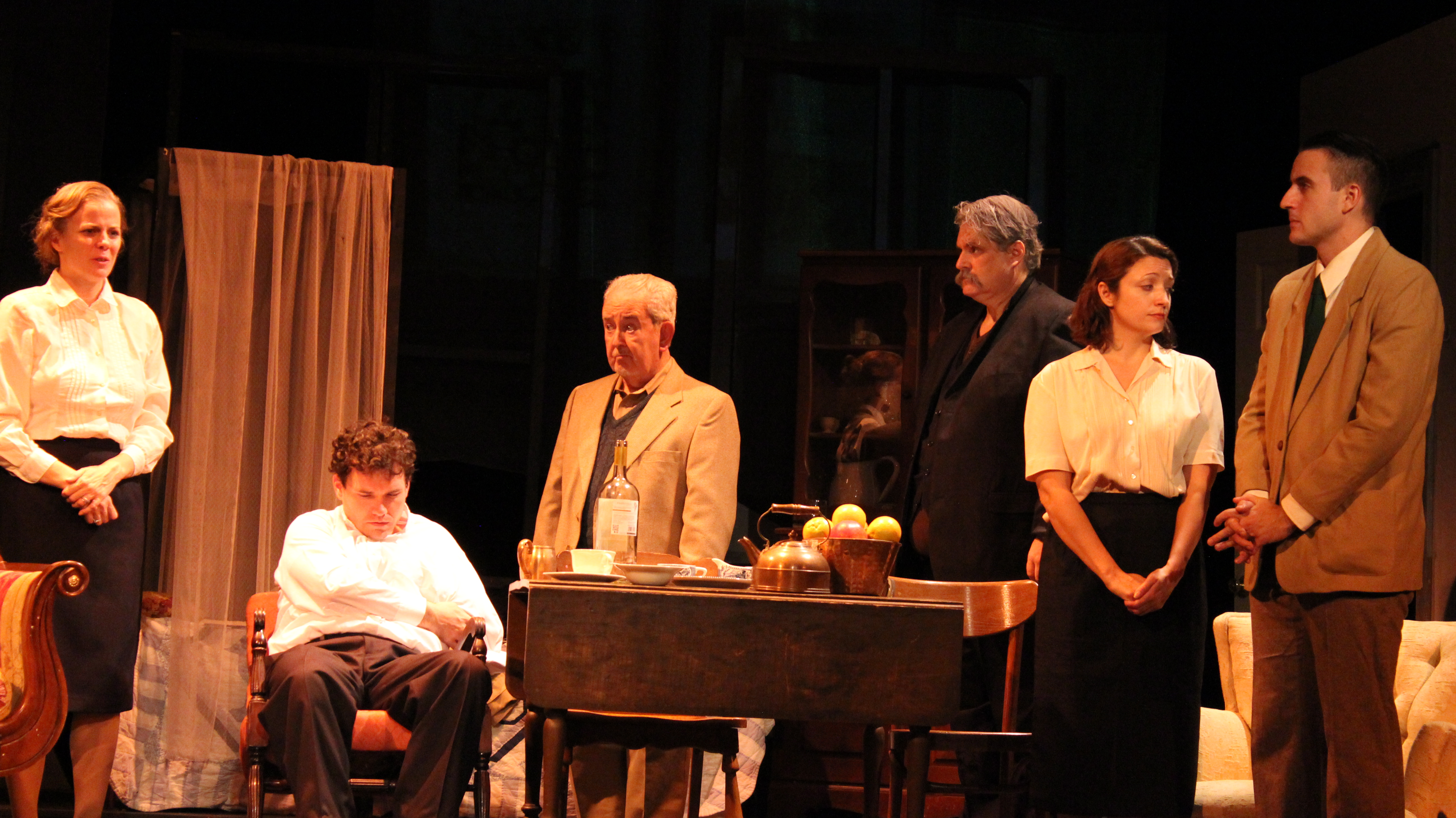 Kirsten Quinn, Kevin Rodden, John Cannon, Ethan Lipkin, Gina Martino, and Dexter Anderson in Juno and the Paycock. (Photos by Armen Pandola and Alexis Mayer)