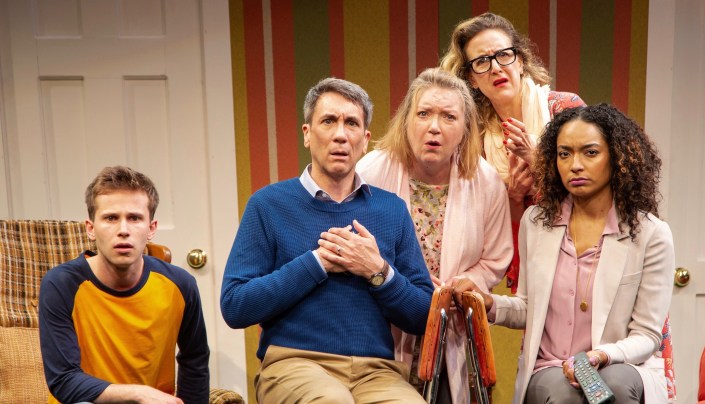 Nicholas Podany, Robert Sella, Kristine Nielsen, Jenn Harris, and Rachel Nicks in Turning Off the Evening News at McCarter Theatre. (Photo by T. Charles Erickson)