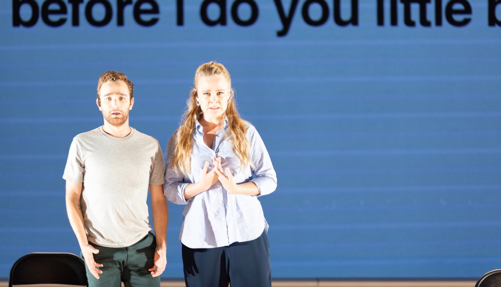 Take Denis & Katya, a superb new two-hander chamber opera by composer Philip Venables and librettist Ted Huffman. What a stark contrast from last night’s gala opening! The enormous, razzle-dazzle The Love for Three Oranges at the Academy of Music was a lot of fun, for sure. But this afternoon, half a block away, and employing the most slimly elegant resources, Denis & Katya was a monumental, dramatically shattering event…