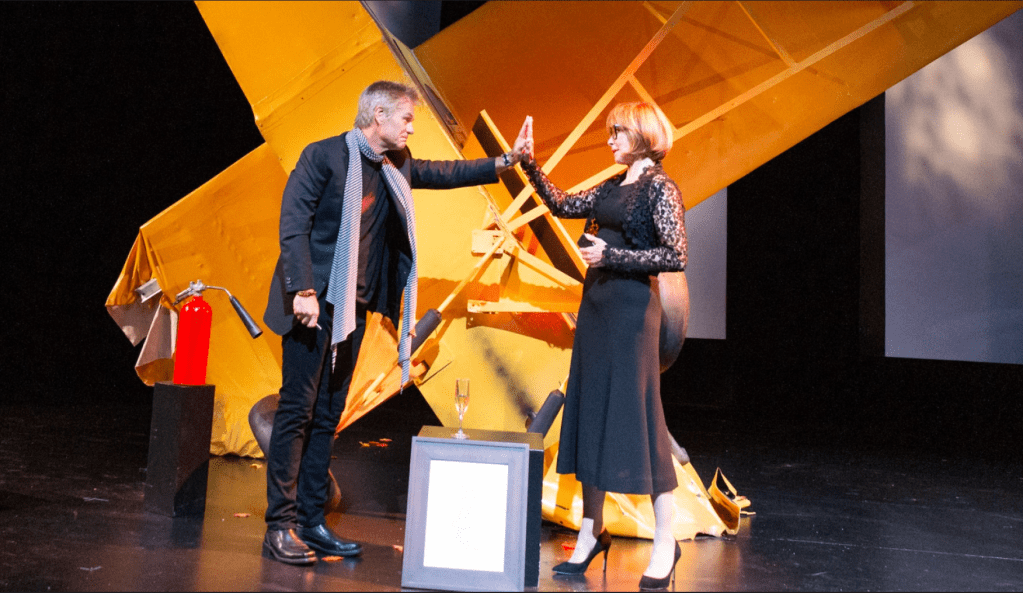 DF: Picking up on two things here—one is that I agree that both Hamlin and Powers seem absolutely comfortable on the stage, including easily projecting their performances into the space. I’m also glad you mention “star acting,” because I think that’s an important element of this show (as it is in Plaza Suite). It’s a special kind of acting, one where on the one hand you want to see the skills it takes to create different sets of characters—but at the same time, you want to be aware at least subtly of the actors’ own personae. And I think these two manage both sides of that with exceptional skill and grace.
