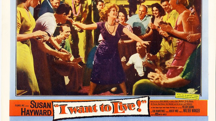 David Fox: The tonal shifts here are enormous, and they start from the very beginning. As you say, a quote from no less than Albert Camus (he had won the Nobel Prize in 1957, one year before this movie)… followed moments later by the production company, Figaro Film, cute cartoon insignia, accompanied by some cheerful piano riffing on the Mozart overture. No sooner is that finished than we move into one of the truly great jazz film scores, composed by Johnny Mandel with a group of legendary musicians including Gerry Mulligan and Shelly Mann (both of whom make cameo appearances) and a visual world full of noir edginess. The setting is a nightclub, and we know it’s hip because everything is shot at an angle. It’s a lot to take in… and we haven’t even gotten to Susan Hayward yet! I have to say I struggle with I Want to Live! The camp appeal of it—including Hayward’s performance—is undeniable… yet it’s also a sincere and even important movie. Watching it this time, I realized that the Rosenberg execution had happened only five years earlier. It’s often an awkward movie, but sometimes a major one. Much the same could be said of Hayward’s Oscar-winning performance…
