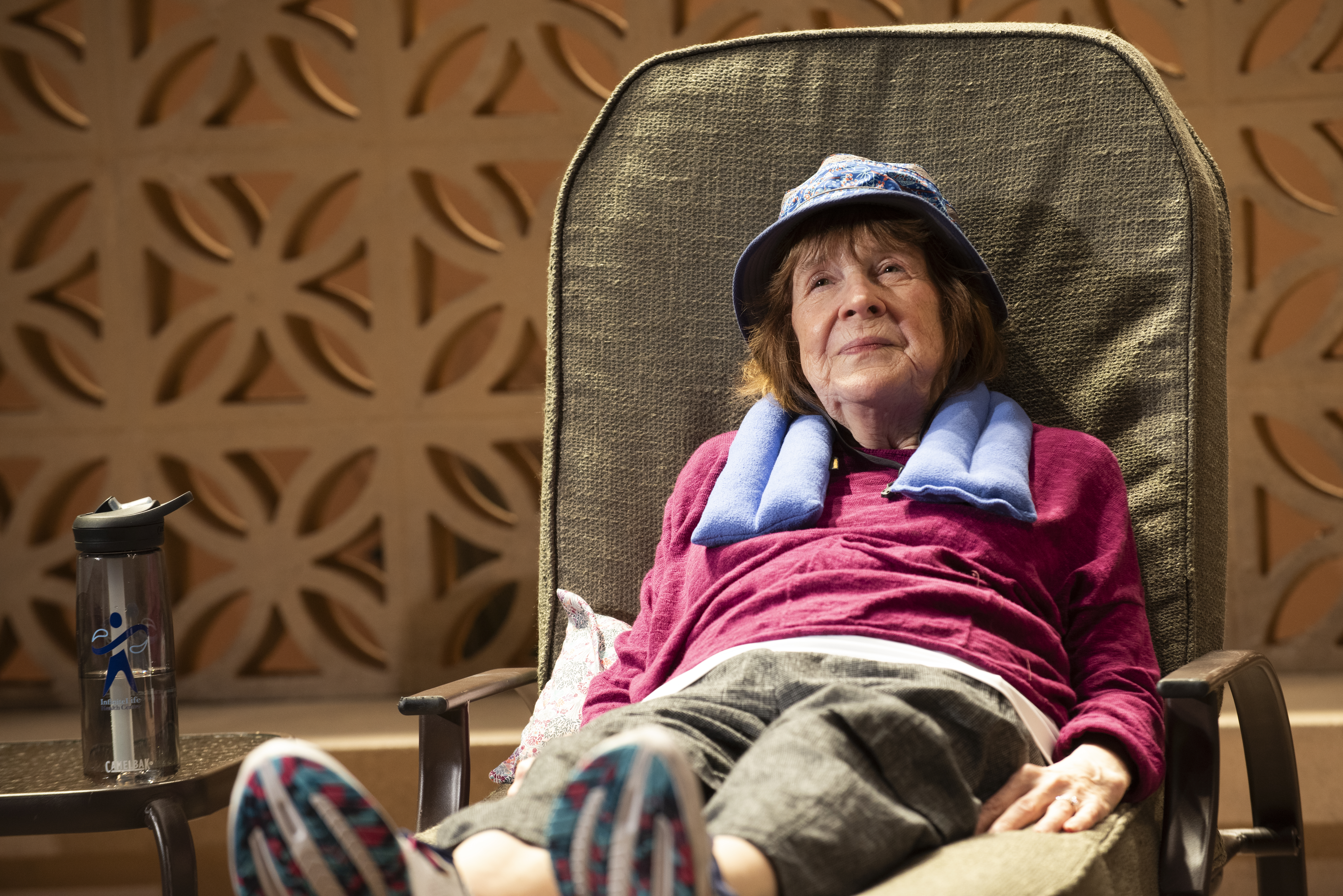 If it’s a summary you want, that’s fairly easy. We are outdoors somewhere north of San Francisco—in a courtyard or perhaps by a pool: the stage is filled with groupings of chaise lounges. Five women come and go here. Sofi (Christina Kirk) is 47; Eileen (Burke), Elaine (Brenda Pressley), Ginnie (Kristine Nielsen), Yvette (Mia Katigbak) are all older. There’s also one male, Nelson (Pete Simpson) who’s a hunky guy in his 40s who likes to hang out shirtless. (Nelson here is the living definition of “odd man out.”) Everybody lies around chatting or reading or dozing, presumably to make it feel more like a vacation.