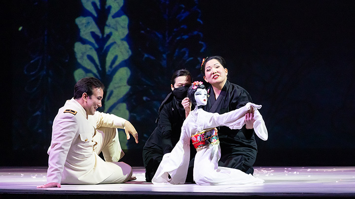 One central one is that Pinkerton thinks of Butterfly as his “doll.” This is established at the start in a pantomime prologue, as he buys a large figurine of a geisha, which is later manipulated by the soprano singing Cio Cio San (Karen Chia-Ling Ho). Sometimes the puppet would suggest a submissive persona that enveloped Cio Cio San; at other times, it would be taken from her by black robed puppeteers, with the implication that she was separating her true self from this illusion.