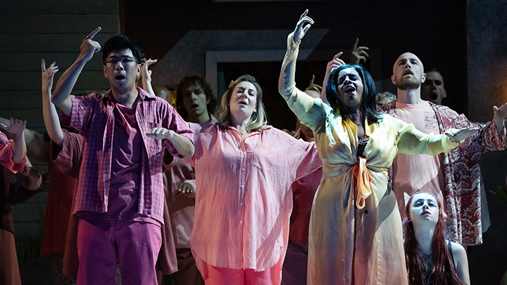 There’s excellent supporting work from a large ensemble that includes baritones John Moore (a superb actor and a veteran also of Breaking the Waves), Joseph Lim and Troy Cook, mezzo Lucy Schaufer, sopranos Diana Newman and Lindsey Reynolds (the latter with a special sparkle), tenor Aaron Crouch, and more. Kevin Burdette brought exemplary diction to the character of Howard, the leader—every word “landed”—but his rather light tone and genial affect aren’t quite the right fit here.